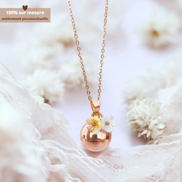 Délicat et lumineux, ce bola de grossesse personnalisé est orné de fleurs nacrées élégantes qui apportent une touche de douceur et de raffinement à ce bijou de maternité.