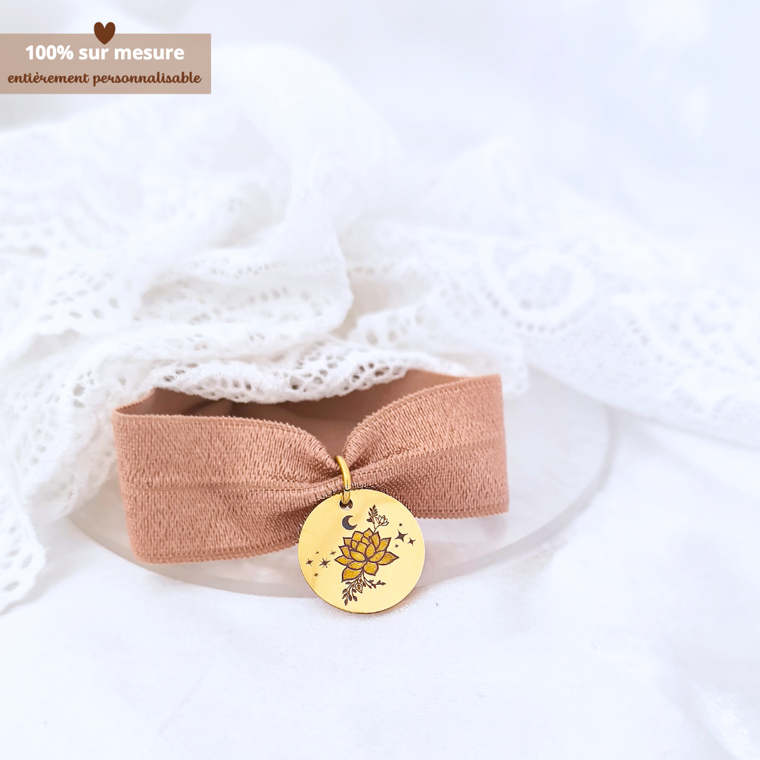 Le médaillon en acier inoxydable est apprécié pour sa résistance, sa durabilité et son élégance. Le ruban, proposé en plusieurs coloris, apporte une touche douce et personnalisée à ce bracelet gravé personnalisé.