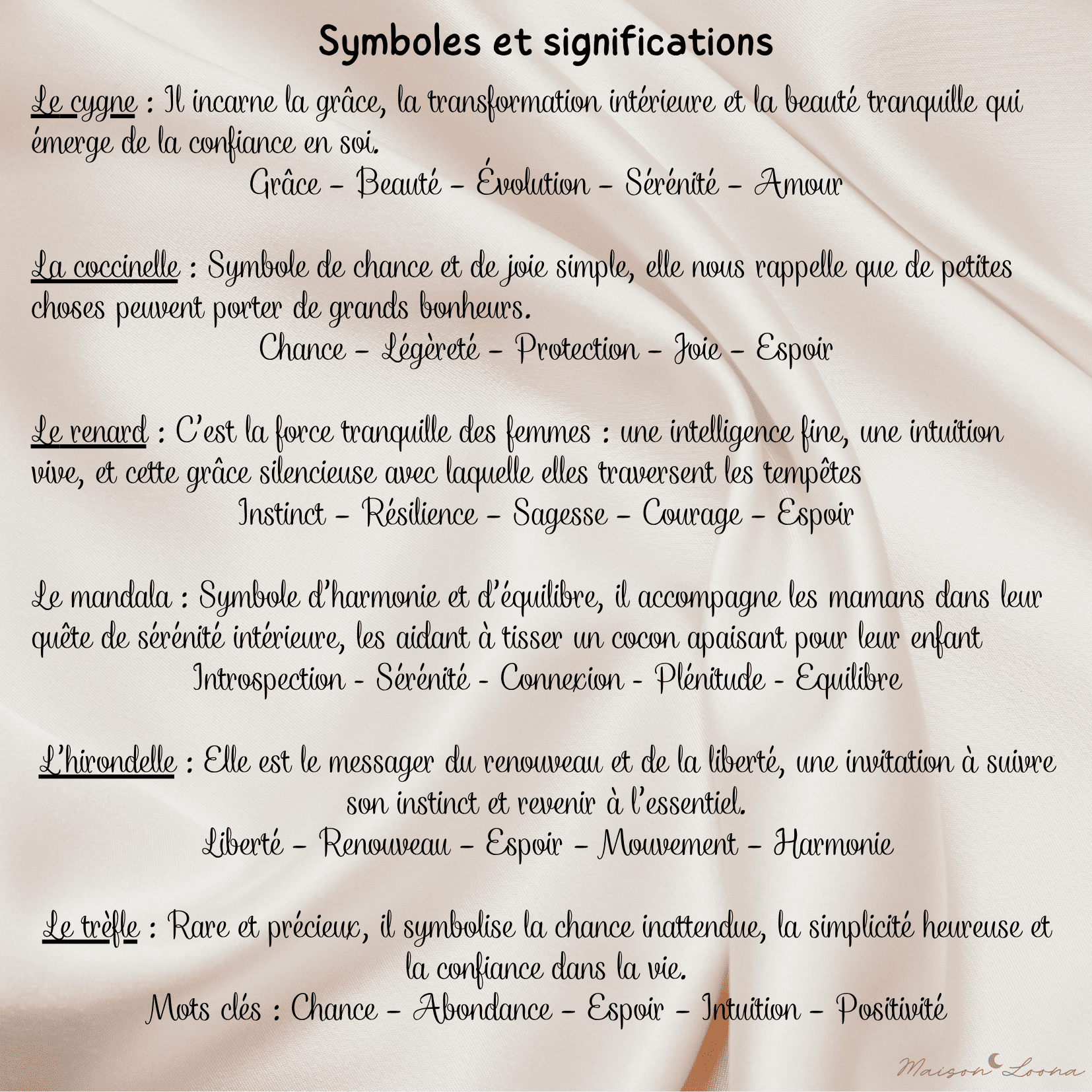 ♥ La plume : Légère et délicate, la plume symbolise la protection maternelle, les messages du cœur et la connexion spirituelle avec nos êtres chers